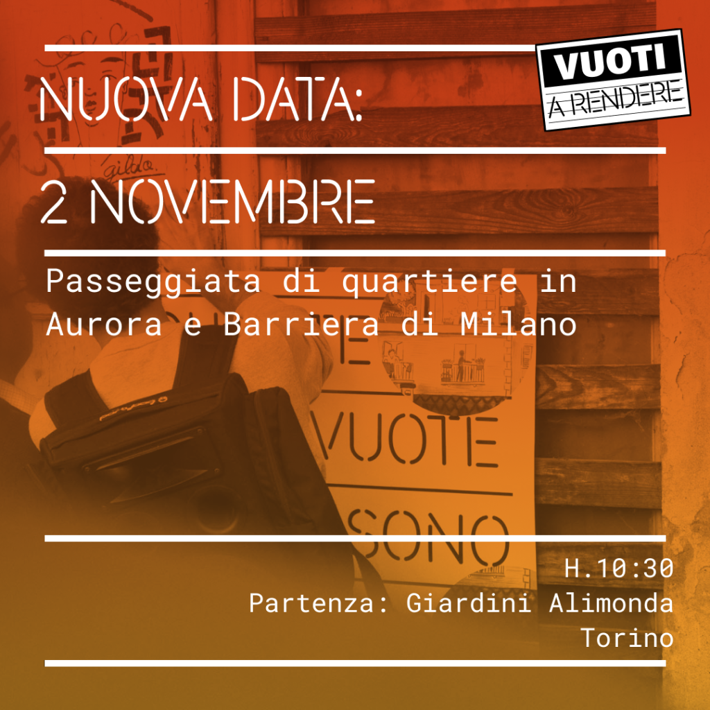 26 Ottobre 2024 @ 10:30 – 12:00 – Passeggiata di quartiere in Aurora e Barriera di Milano alla ricerca e alla scoperta di vuoti a rendere. 📆Sabato 26 ottobre, H 10:30 📍Ritrovo e partenza ai Giardini Alimonia Conosci gli edifici vuoti di Aurora e Barriera di Milano? Ce ne sono moltissimi, tutti diversi tra loro e sono vuoti per diverse ragioni, ma hanno […]
