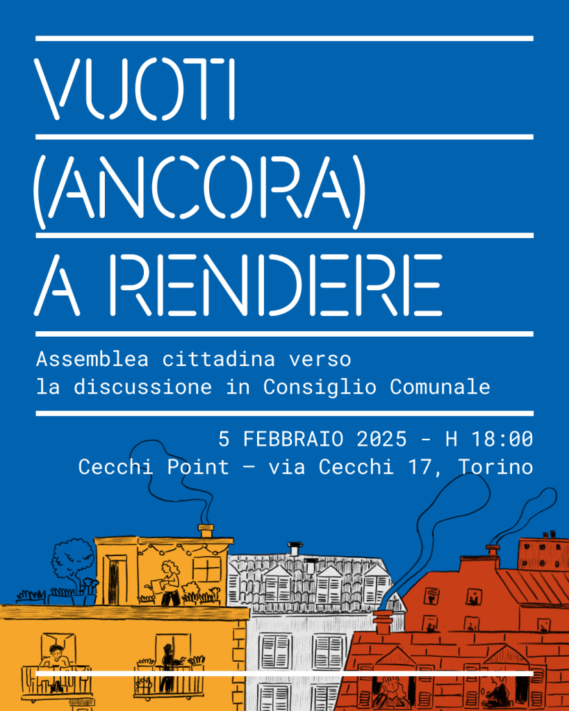 5 Febbraio 2025 @ 18:00 – 19:00 – Alla vigilia dell’inizio dell’esame della nostra proposta da parte del Consiglio comunale è il momento per ritrovarci in una grande assemblea cittadina, con il fine di rilanciare ed estendere la mobilitazione collettiva per tradurre in realtà gli obiettivi di Vuoti a rendere. Insieme a importanti ospiti da altre città – Fabio Manfredini, che per conto […]