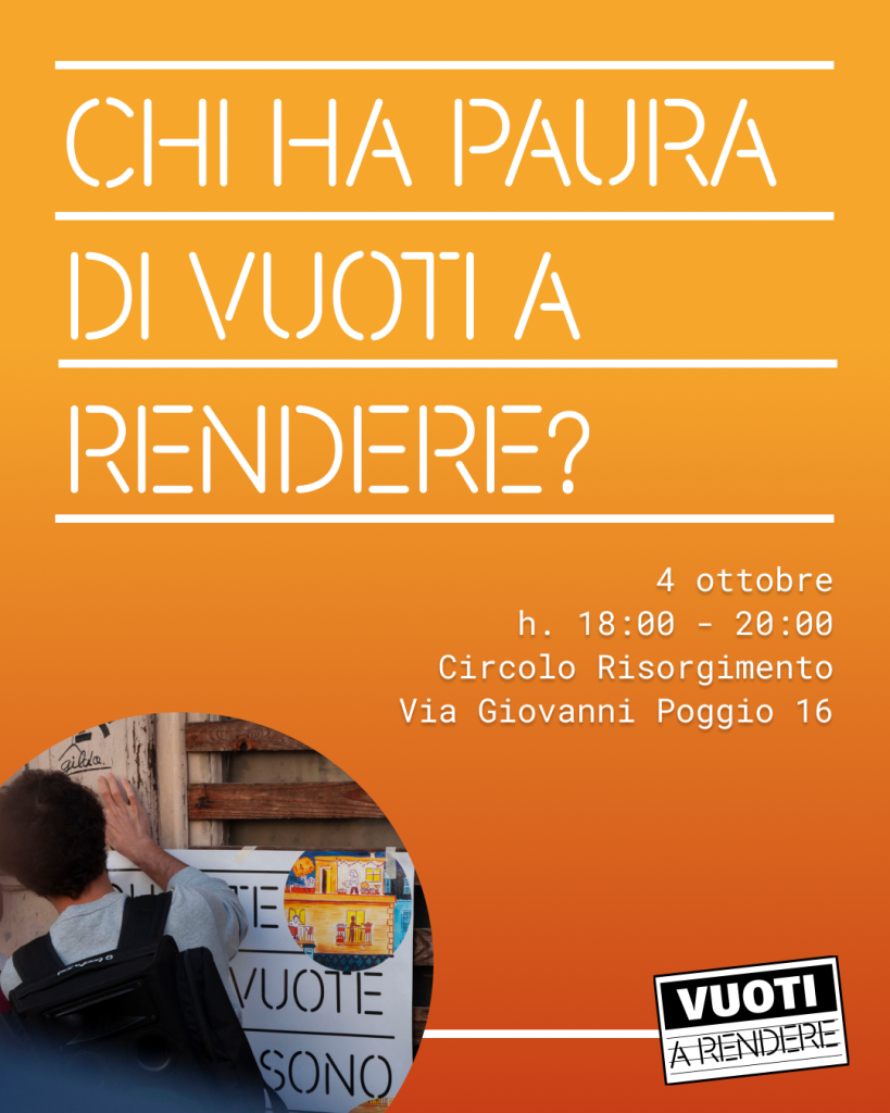 13 Settembre 2024 @ 18:30 – Car3, per riprendere le fila della campagna vi proponiamo una riunione operativa per venerdì 13 settembre, alle 18:30 al Circolo Risorgimento – via Poggio, 16 Sarà l’occasione per organizzarci operativamente sulle attività immaginate nell’assemblea di giugno, in particolare su mappatura cittadina dei vuoti e modalità per seguire e sollecitare l’iter di discussione consiliare. A presto!